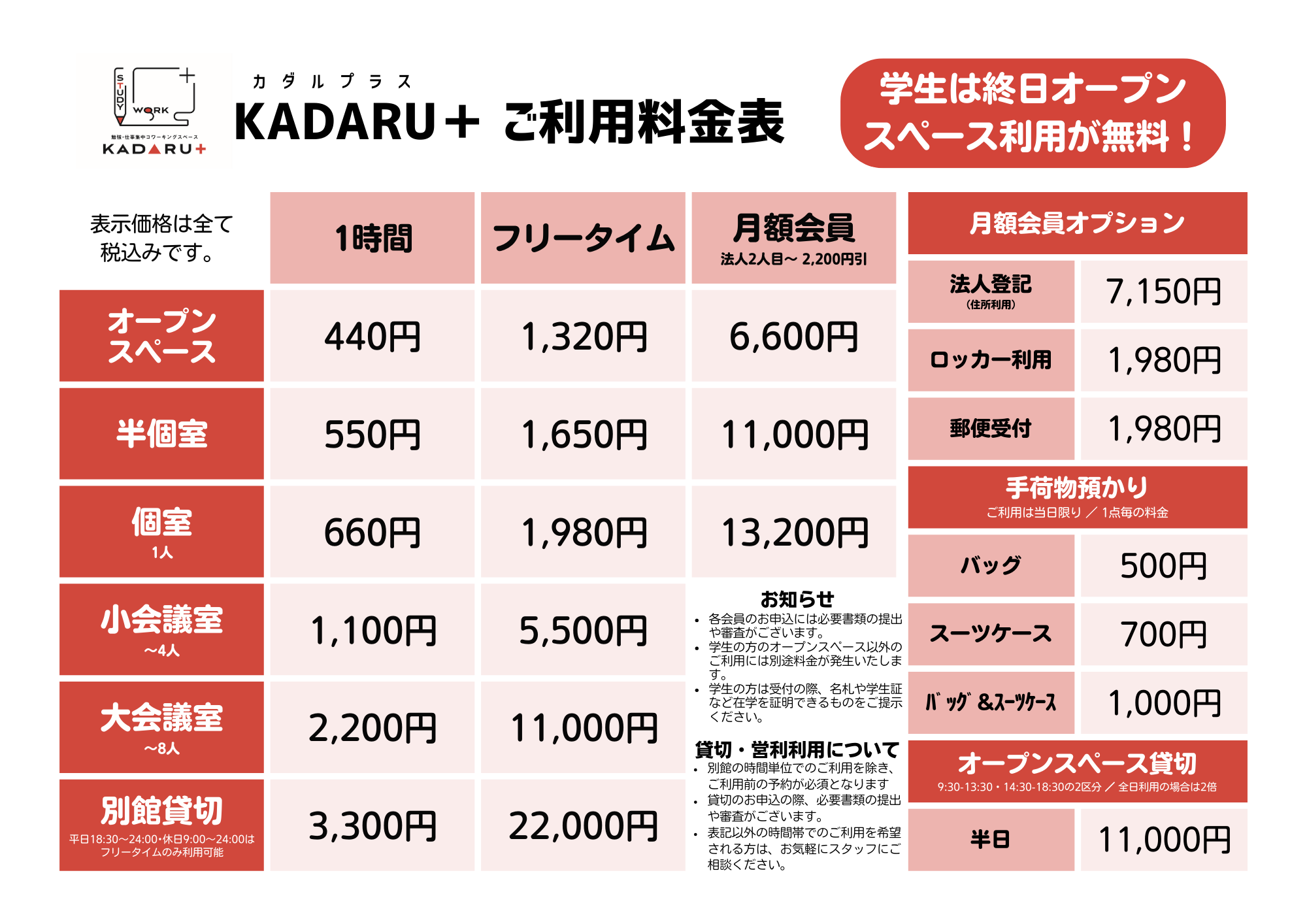 KADARU+(カダルプラス)は、勉強にも仕事にも集中して取り組むことができるコワーキングスペースです。