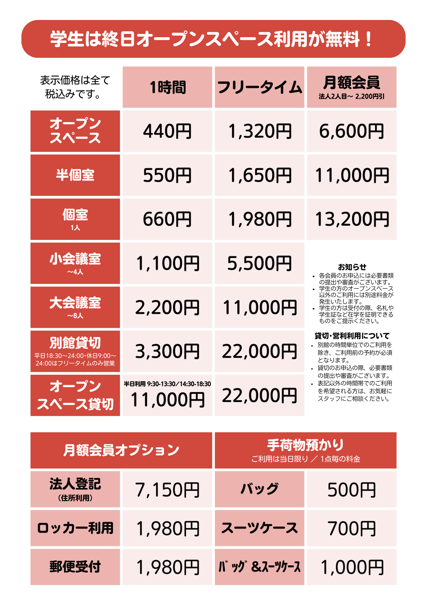 - 予約なしでも、当日空きがあればご利用いただけます。(オープンスペースは予約不要です)